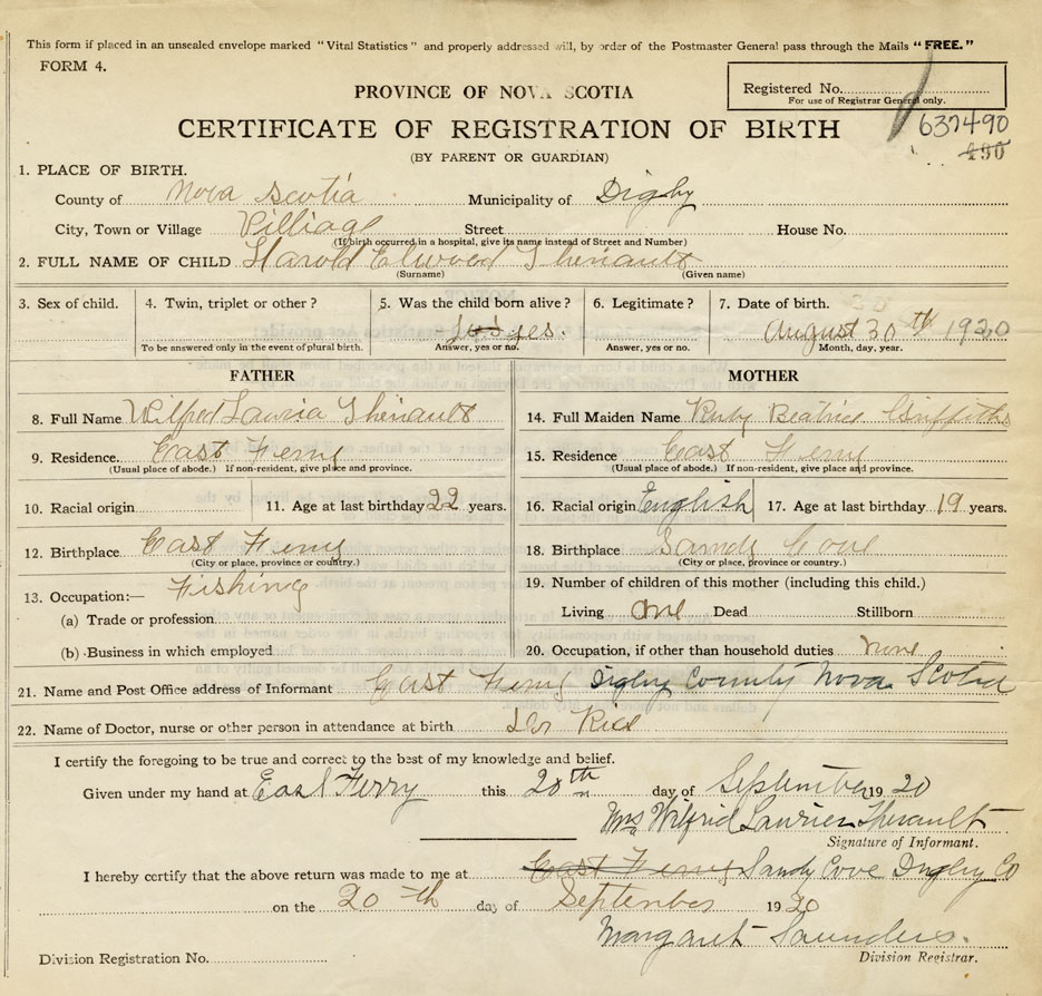 21. Name and Post Office address of Informant Mrs. Wilfrid Laurier Theriault East Ferry, Digby County, Nova Scotia