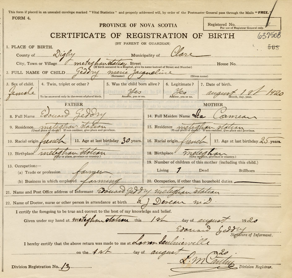 21. Name and Post Office address of Informant Edouard Geddry Meteghan Station