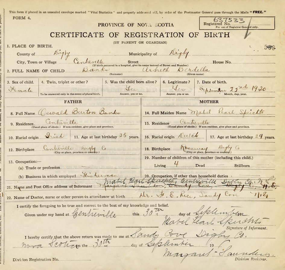 21. Name and Post Office address of Informant Mabel Pearl Speichts Centreville, Digby Co.