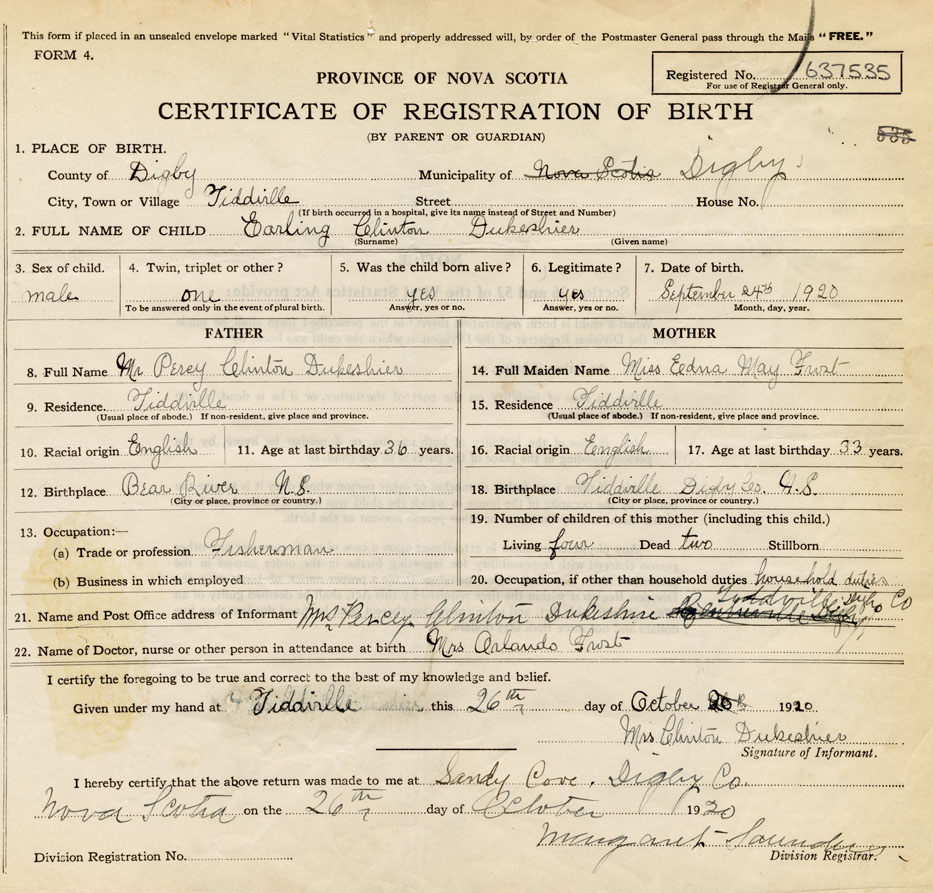 21. Name and Post Office address of Informant Mrs. Percy Clinton Dukeshire Tiddville, Digby Co.