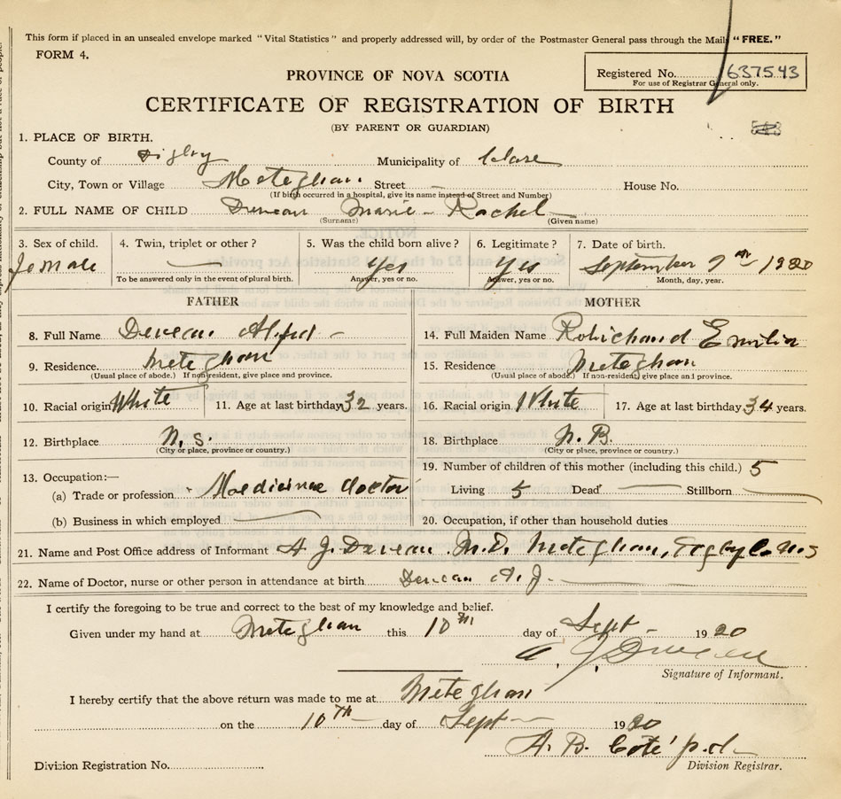 21. Name and Post Office address of Informant A.J. Deveau, M.D. Meteghan, Digby Co. N.S.