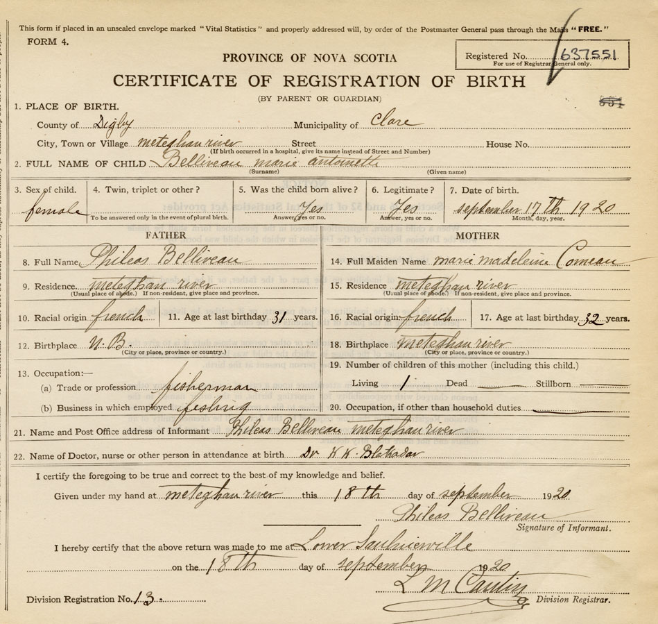 21. Name and Post Office address of Informant Phileas Belliveau Meteghan River
