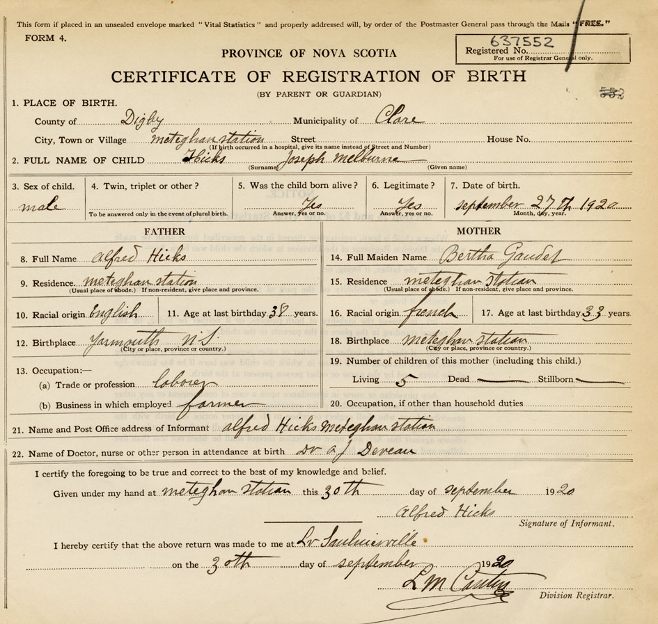21. Name and Post Office address of Informant Alfred Hicks Meteghan Station