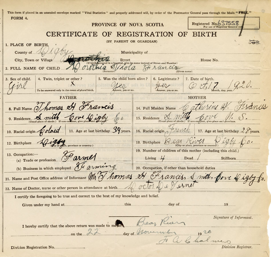 21. Name and Post Office address of Informant Mr Thomas H Francis Smith Cove Digby County