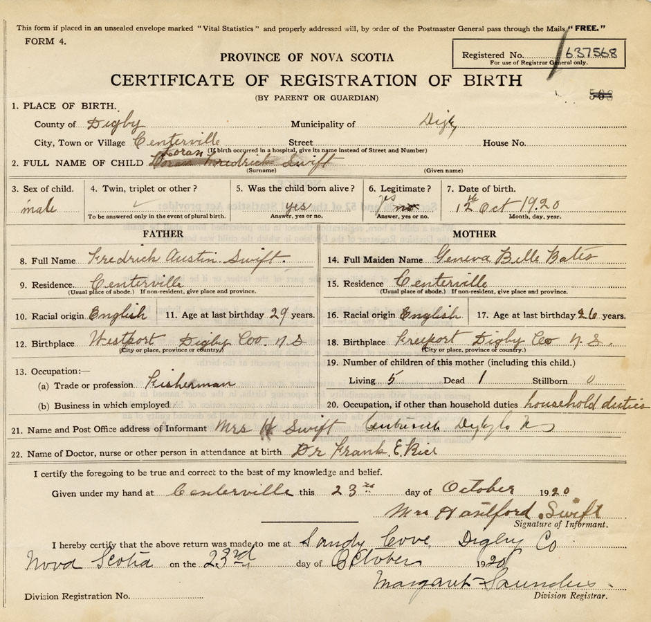 21. Name and Post Office address of Informant Mrs. H. Swift Centreville, Digby Co. N.S.