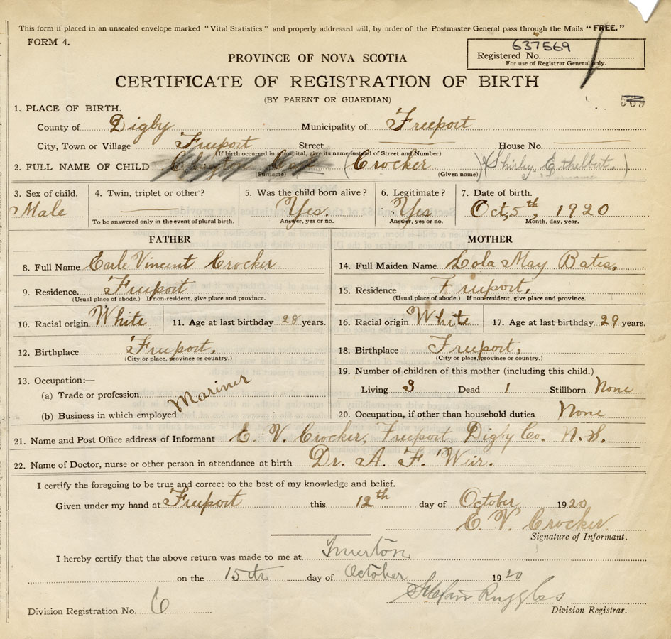 21. Name and Post Office address of Informant E.V. Crocker Freeport, Digby Co. N.S.