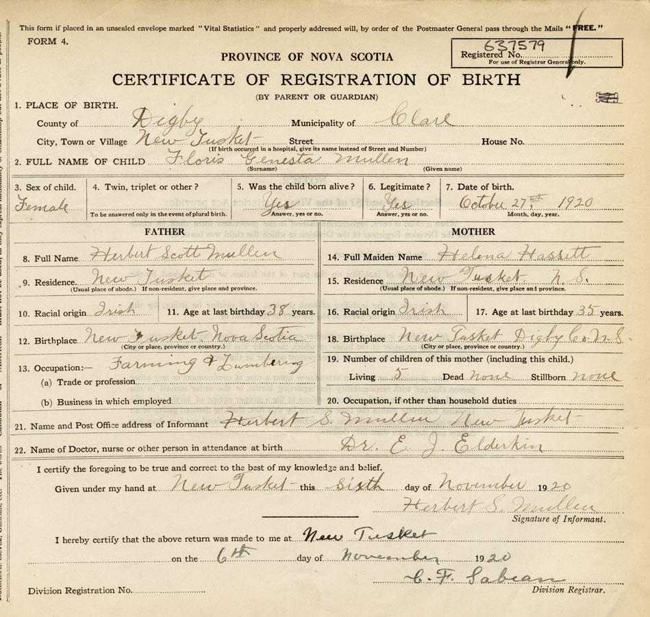 21. Name and Post Office address of Informant Herbert S. Mullen New Tusket