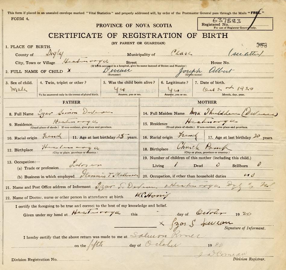 21. Name and Post Office address of Informant Izar S. Deveau Hectangooga, Digby Co. N.S.