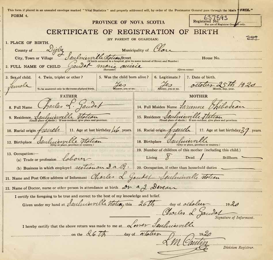 21. Name and Post Office address of Informant Charles L Gaudet Saulnierville Station