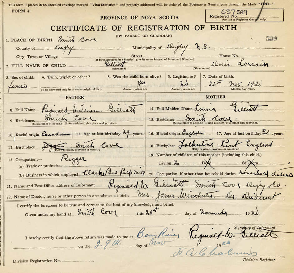 21. Name and Post Office address of Informant Reginald W. Gilliatt Smith Cove, Digby Co.