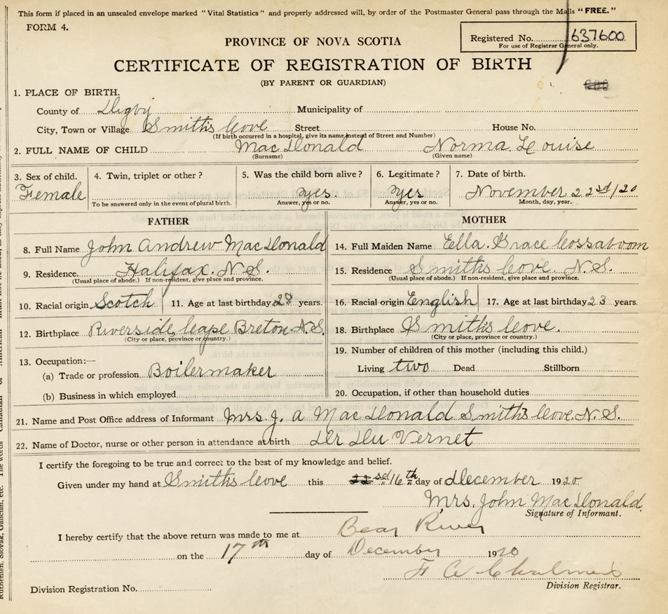 2. FULL NAME OF CHILD MacDonald, Norma Louise