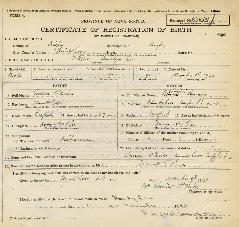 21. Name and Post Office address of Informant Winnie O'Neill Mink Cove, Digby Co. N.S.