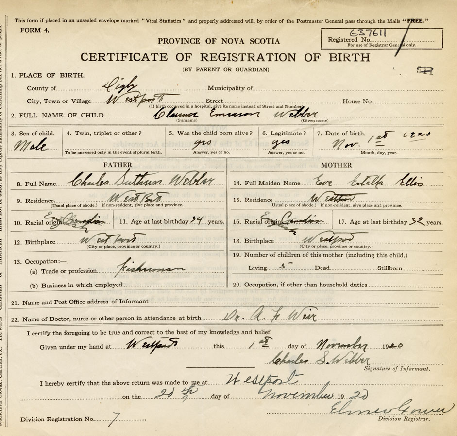 22. Name of Doctor, nurse or other person in attendance at birth Dr. A.F. Weir