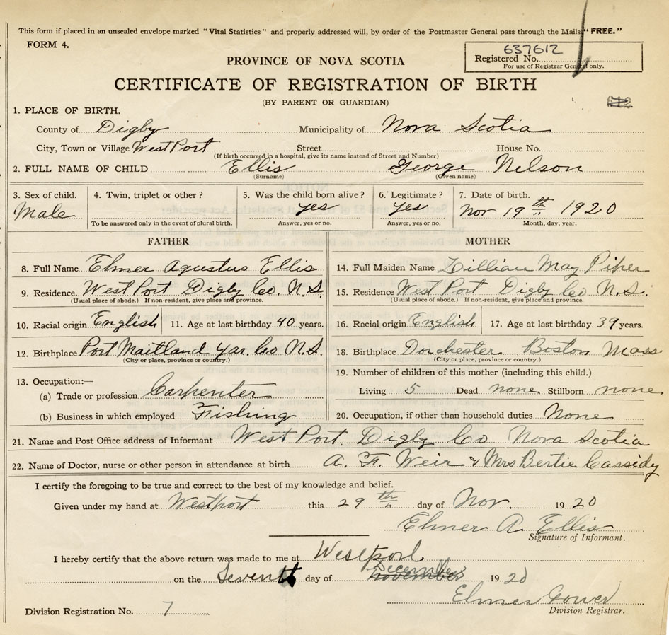 21. Name and Post Office address of Informant Elmer A. Ellis West Port, Digby Co. Nova Scotia