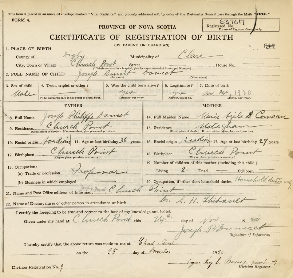 22. Name of Doctor, nurse or other person in attendance at birth Dr. S.H. Thibault