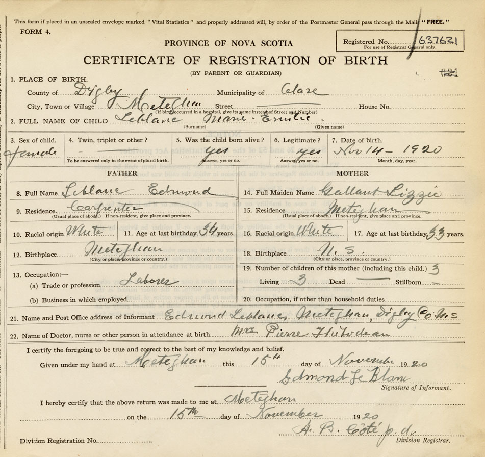 21. Name and Post Office address of Informant Edmond Leblanc Meteghan, Digby Co. N.S.