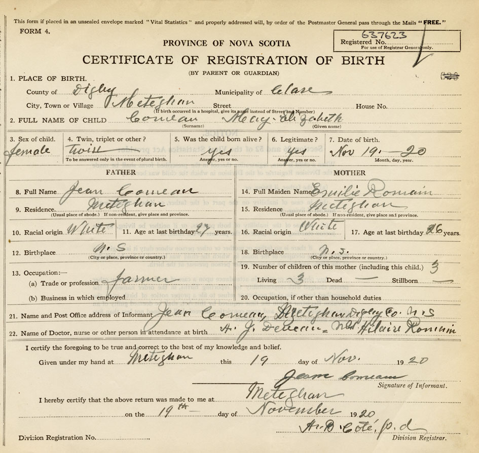 21. Name and Post Office address of Informant Jean Comeau Meteghan Digby Co. N.S