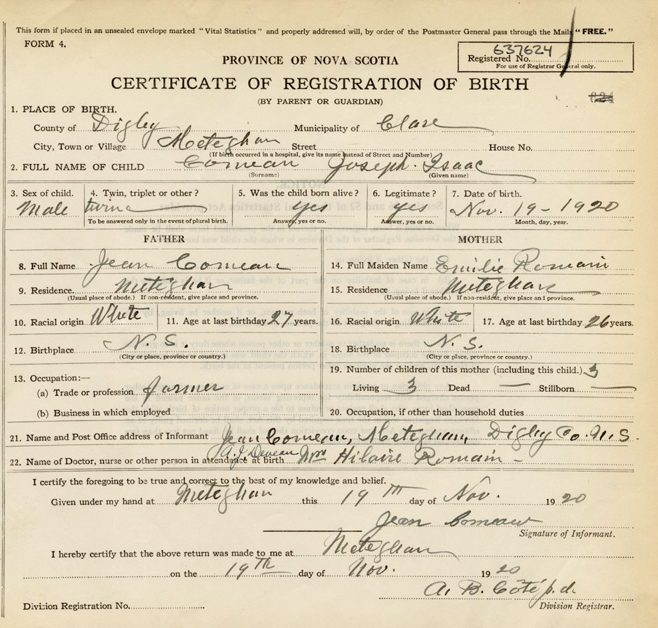 21. Name and Post Office address of Informant Jean Comeau Meteghan Digby Co N.S