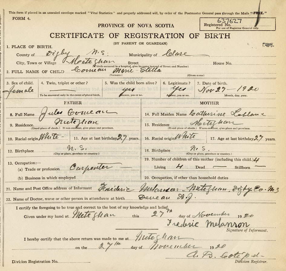 21. Name and Post Office address of Informant Frederic Melanson Meteghan, Digby Co.