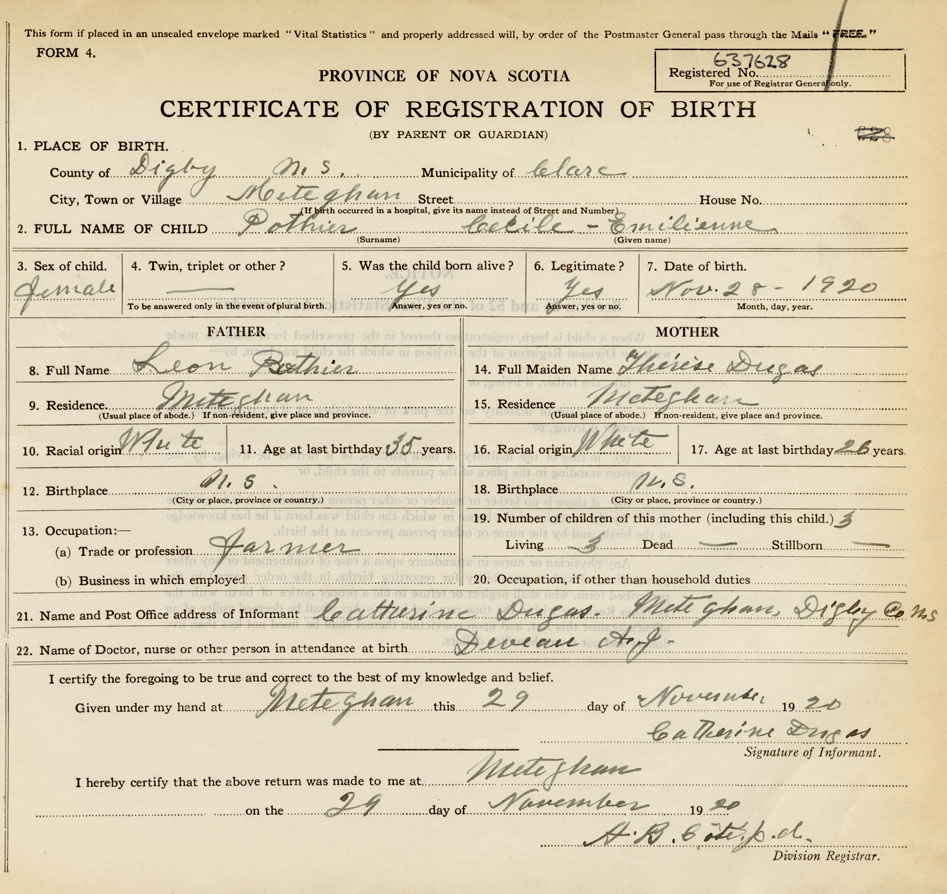 21. Name and Post Office address of Informant Catherine Dugas Meteghan, Digby Co.