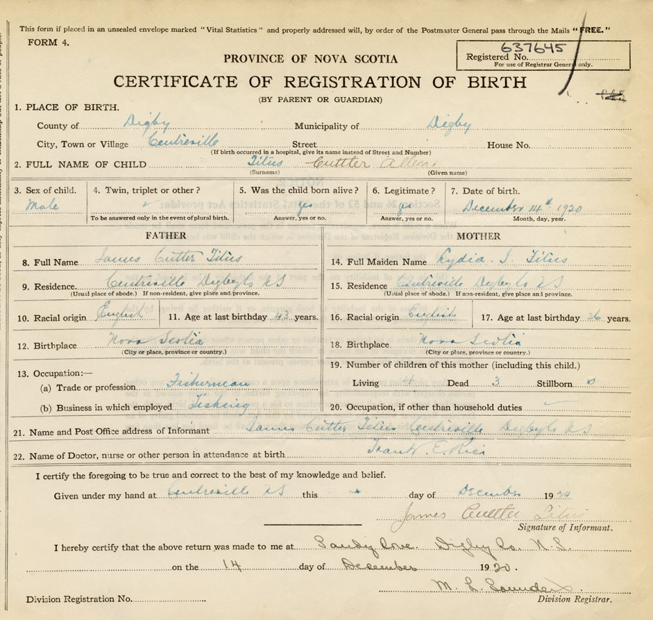 21. Name and Post Office address of Informant James Cutter Titus Centreville, Digby Co. N.S.