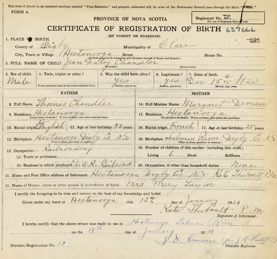 21. Name and Post Office address of Informant Kate Thibault, P.M. Hectanooga, Digby Co. NS