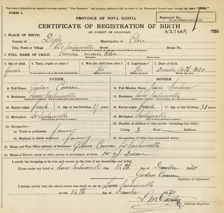 21. Name and Post Office address of Informant Gustave Comeau Lower Saulnierville