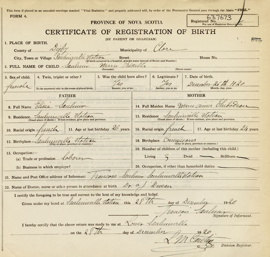 21. Name and Post Office address of Informant Francois Saulnier Saulnierville Station, Digby Co.
