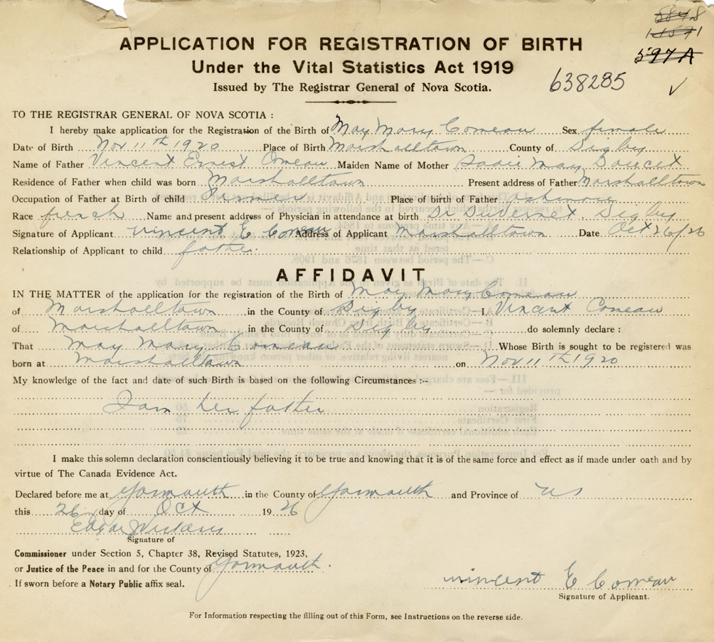 21. Name and Post Office address of Informant Vincent E. Comeau Marshalltown, Digby Co.