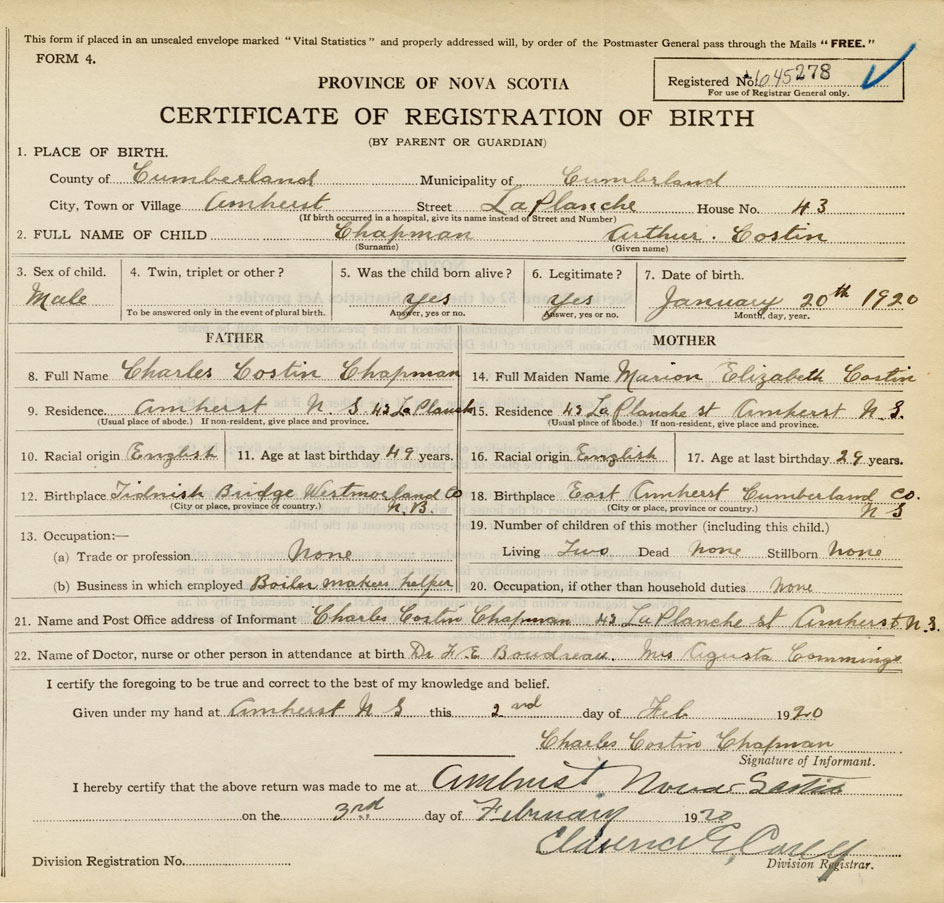 21. Name and Post Office address of Informant Charles Costin Chapman 43 La Planche St. Amherst, New Brunswick