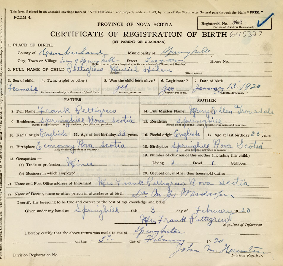 21. Name and Post Office address of Informant Mrs. Frank Pettigrew Nova Scotia