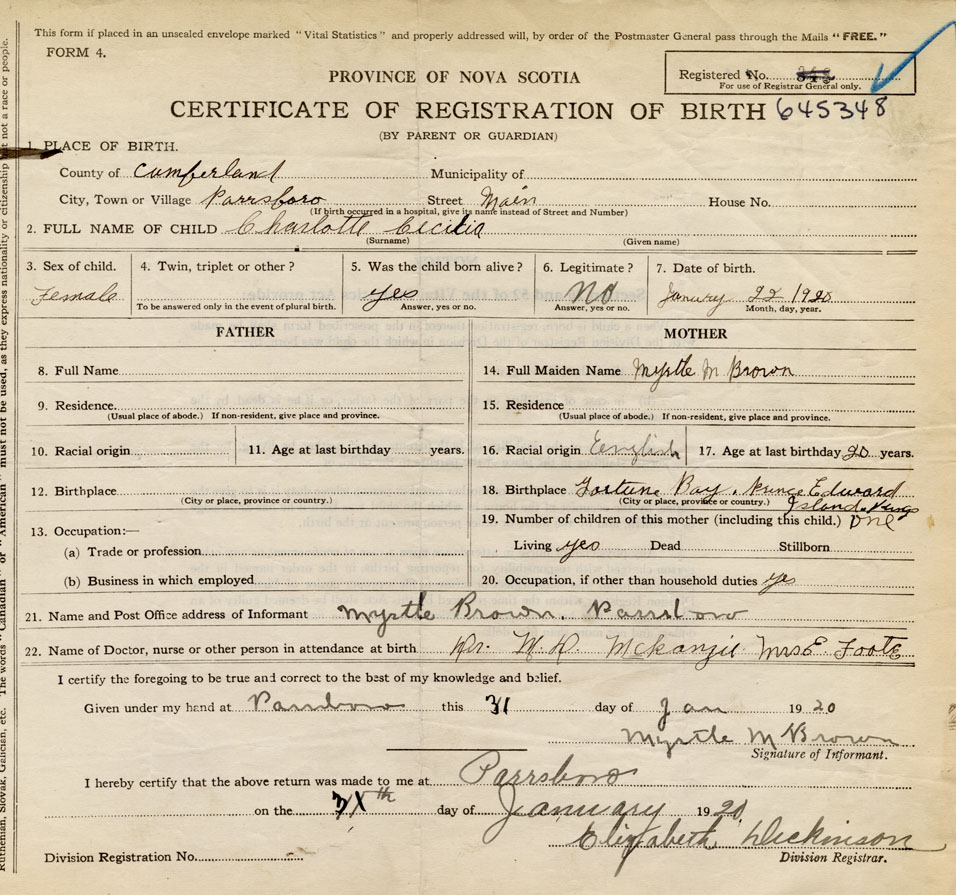 21. Name and Post Office address of Informant Myrtle Brown Parrsboro
