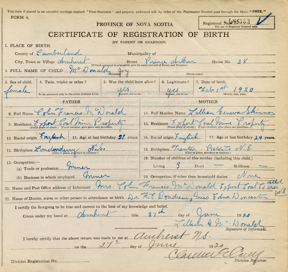 21. Name and Post Office address of Informant Mrs. Colin Francis McDonald Export Coal Co. via Athol N.S.