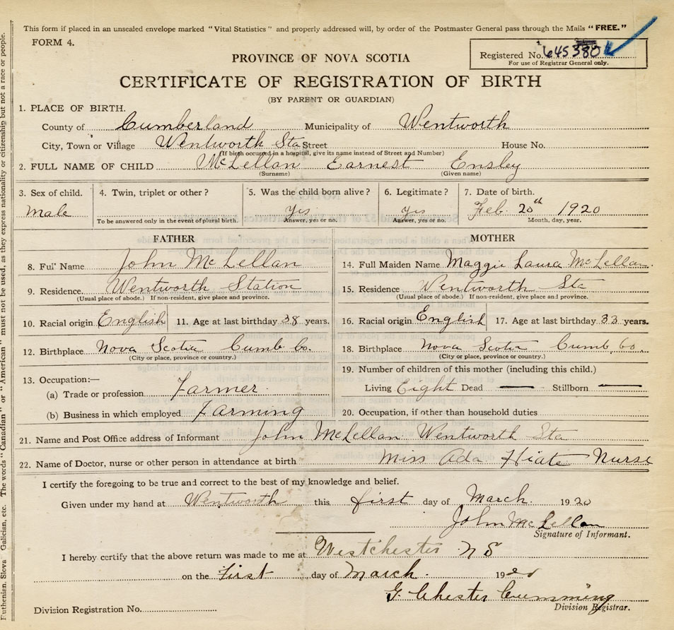 18. Birthplace Nova Scotia Cumb. Co.