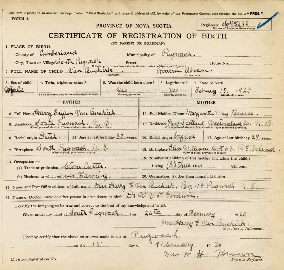 21. Name and Post Office address of Informant Mrs Harry G Van Buskirk Box 119, Pugwash