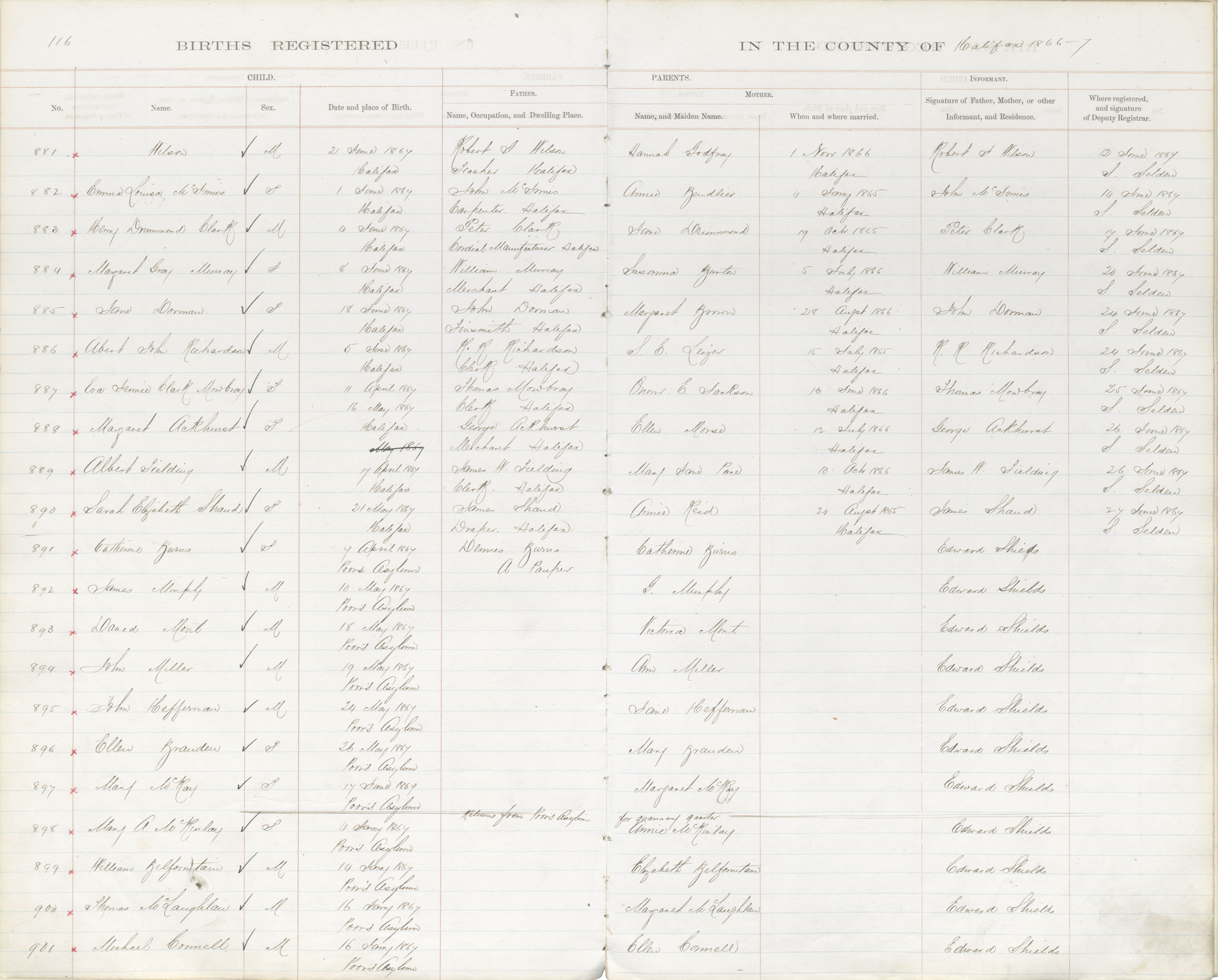 Male Birth Registration: Year: 1867 book: 1809 page: 116 number: 881