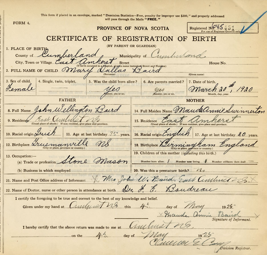 21. Name and Post Office address of Informant Mrs John W. Baird East Amherst N.S