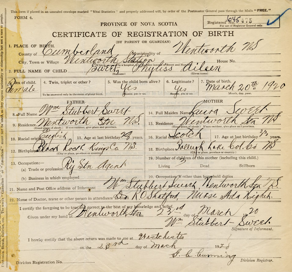 21. Name and Post Office address of Informant Wm. Stubbert Sweet Wentworth Stn. N.S.