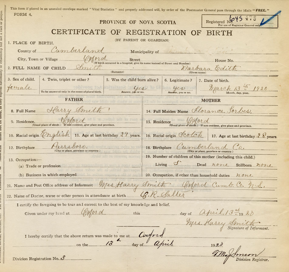 21. Name and Post Office address of Informant Mrs. Harry Smith Oxford, Cumb. Co. N.S.