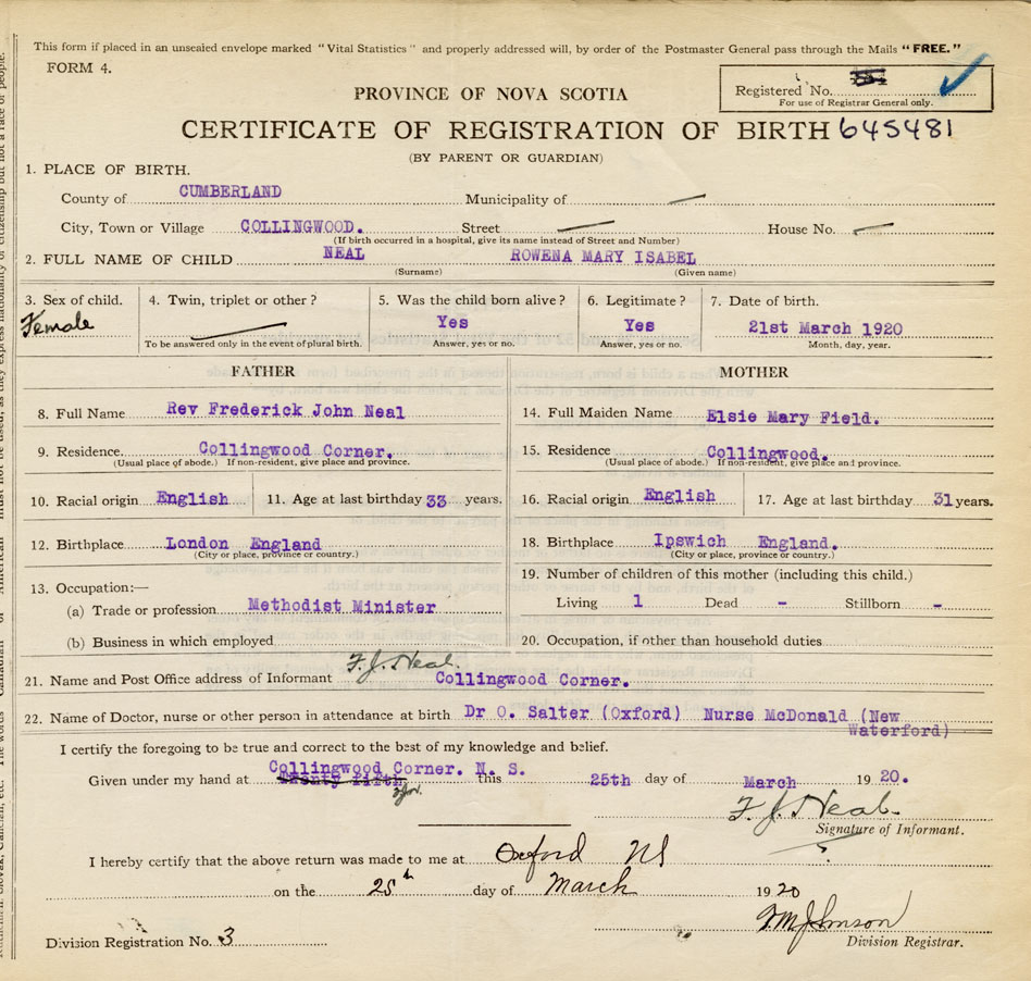 22. Name of Doctor, nurse or other person in attendance at birth Dr. O. Salter (Oxford), Nurse McDonald (New Waterford)