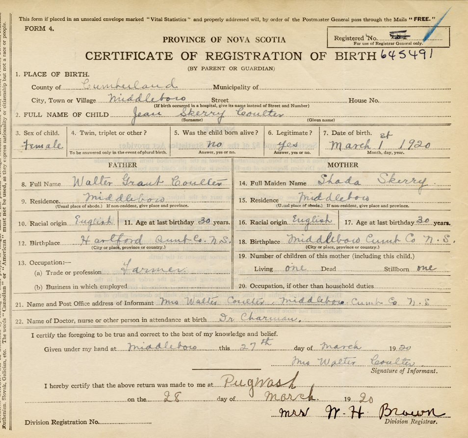 21. Name and Post Office address of Informant Mrs. Walter Coulter Middleboro, Cumb. Co. N.S.