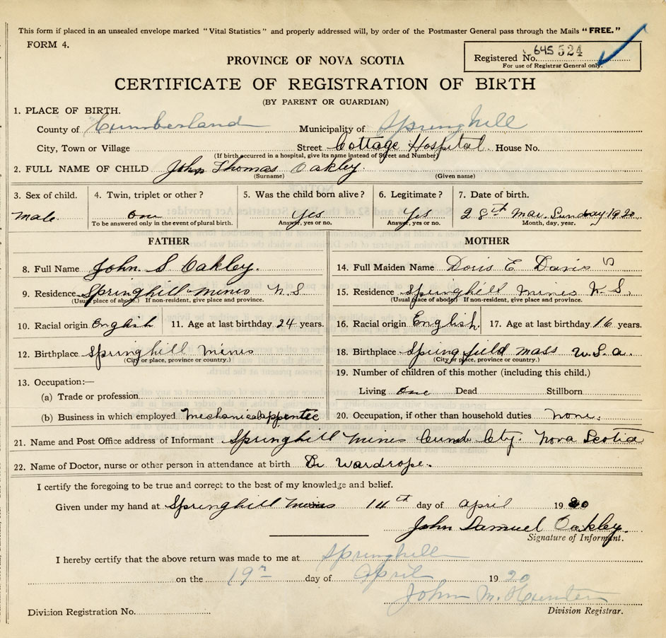 21. Name and Post Office address of Informant John Samuel Oakley Springhill Mines, Cumb. Cty. Nova Scotia