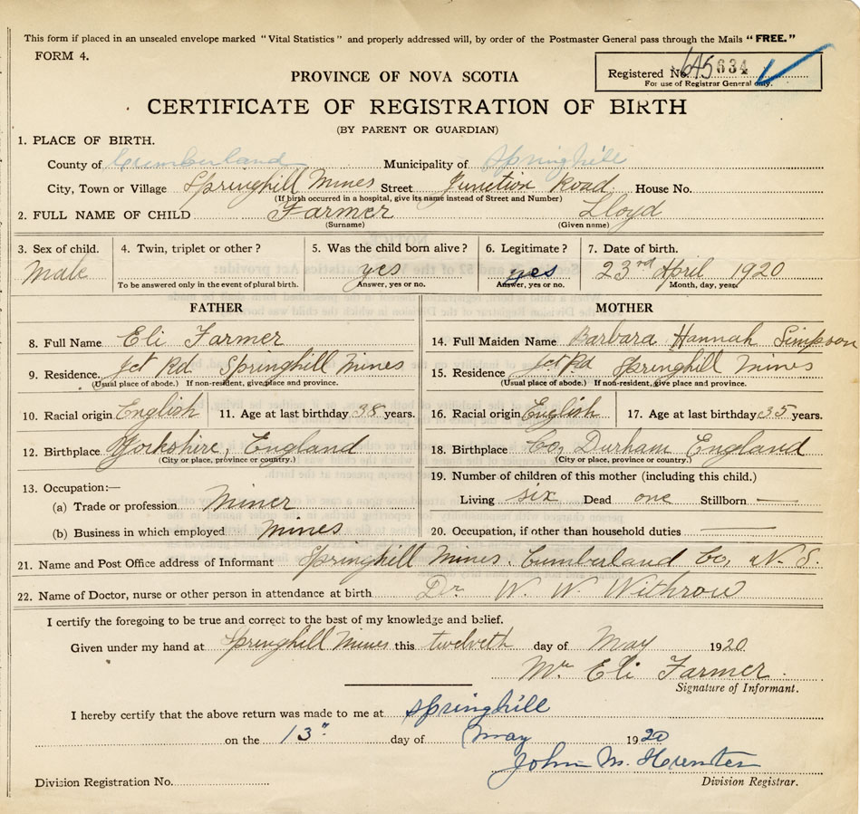 21. Name and Post Office address of Informant Mr. Eli Farmer Springhill Mines, Cumberland Co.