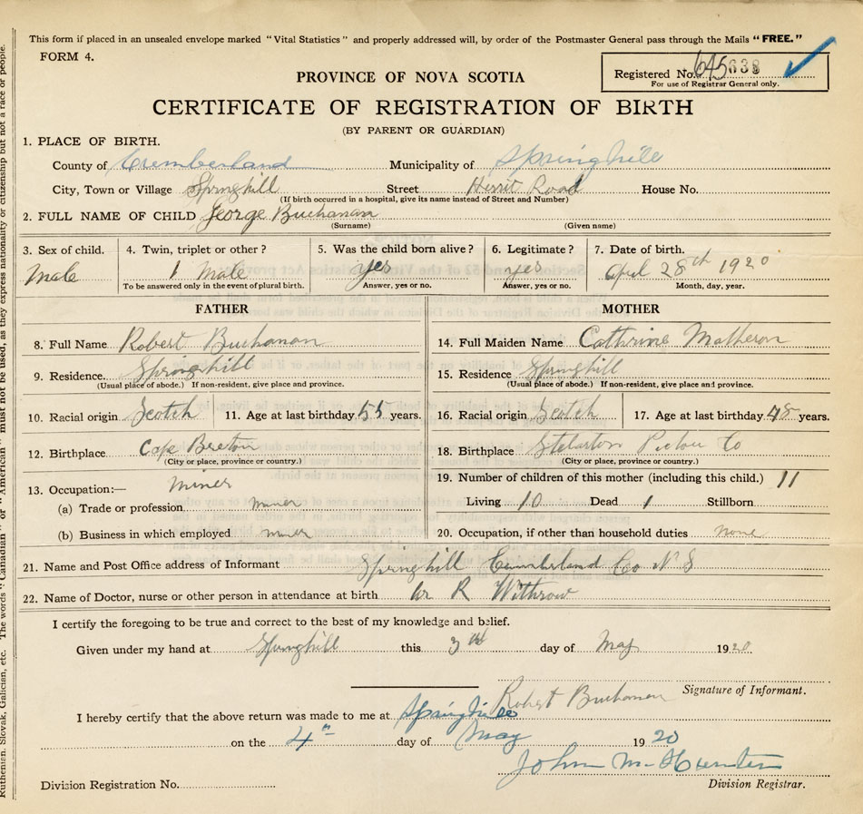 21. Name and Post Office address of Informant Robert Buchanan Springhill, Cumberland Co. N.S.