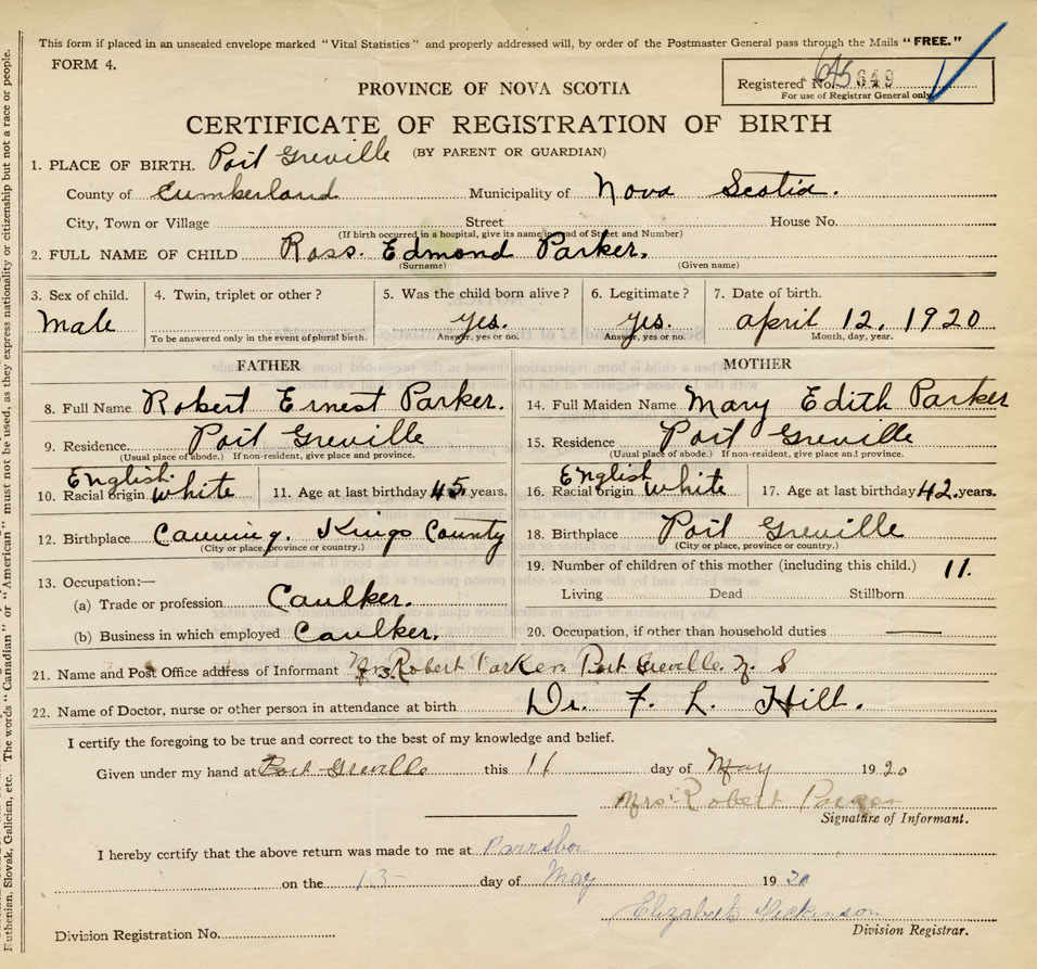 21. Name and Post Office address of Informant Mrs Robert Parker Port Greville N.S.
