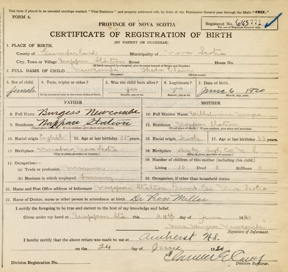 21. Name and Post Office address of Informant Mrs. Burgess Newcombe Nappan Station, Cumb. Co. Nova Scotia
