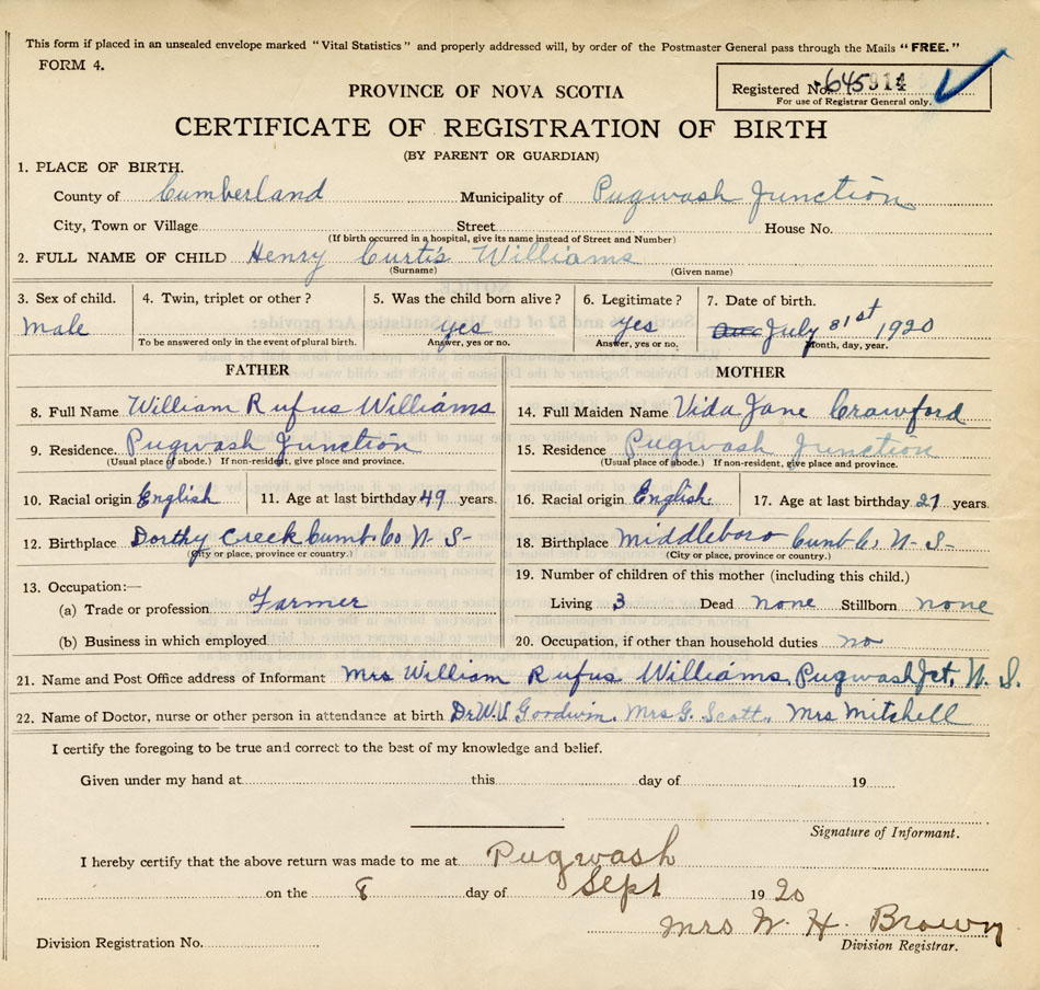 21. Name and Post Office address of Informant Mrs. William Rufus Williams Pugwash Junction