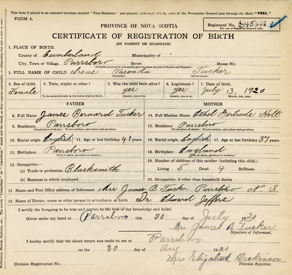 21. Name and Post Office address of Informant Mrs. James B. Tucker Parrsboro