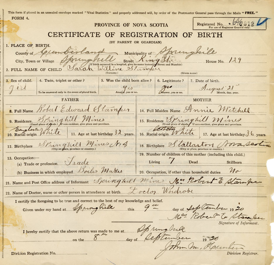 21. Name and Post Office address of Informant Mrs. Robert E. Stamper Springhill Mines