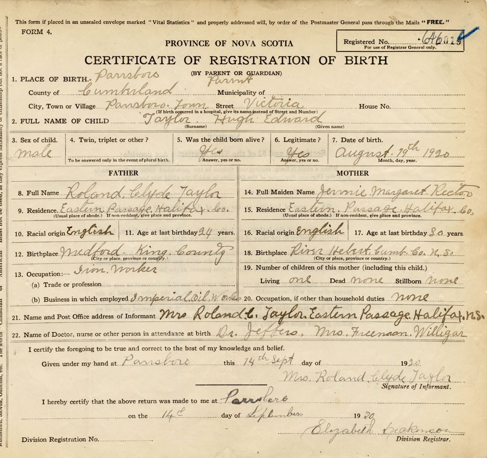 21. Name and Post Office address of Informant Mrs. Roland C. Taylor Eastern Passage, Halifax
